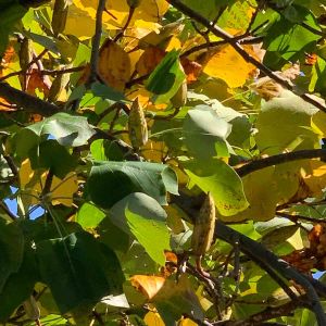 おはようございます😃 近くの公園です。 ユリノキが黄色く黄葉してきました。 とうもろこしのような実が立っているのが見えるでしょうか。 この実は葉っぱが落ちる頃、チューリップが開くように割れます。 実から剥がれた翼の付いた種子がたくさん飛び出します。 冬が過ぎて春が近づく頃まで、この殻は木に残ります。 私は、この木の名前の由来はこの殻の姿がユリの殻に似ているからだと思っています。🤔 自由画NO6で、投稿しました。😅 この木の葉っぱは昔の半纏の形(Tシャツの形)をしているので、別名ハンテンボクとも言います。 この葉っぱで覚えると、間違えません。👍