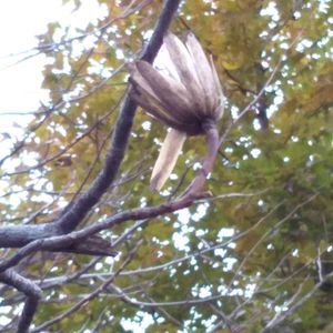 公園沿いの散歩道で面白い実を見つけました🎵 ユリノキですよね⁉️ 何度も通っているのに初めて気付きました😅 来年は是非とも花を見てみたいです😃🎶 <ユリノキ>(百合の木) モクレン科ユリノキ属 落葉高木 別名 ハンテンボク、 チューリップツリー 開花期 5~6月 百合の花に似た淡黄緑 色でオレンジ色の模様 果実は集合果で複数の子房(雌しべ)が集まってできる 翼果と言われ、晩秋から冬にクルクル回転しながら散布される