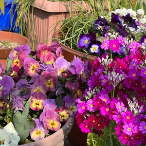 こんばんゎ(ॢ•ᴗ• ॢ) *:・゚✧ サクラソウ(マラコイデス) やっと咲き始めて参りました〜🤗 色違いで1色づつをそれぞれプランター(2鉢)へビオラと一緒に植え付けを……💟💜💟💜✨ 名もないビオラ& 定番の普通のサクラソウ🌸 ちょっとしたアプローチのアクセントになってくれそうです:*:✼✿ (*˙˘˙*)。゚:*:✼.。✿.。