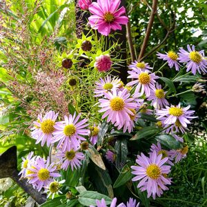 こんにちは😌 洗濯物がカラッと乾きませんね。。。 今週は☁️☁️☔陽ざしほしいな〜 ①ウィンターコスモス 切り戻し2回したけど草丈2メートル😱 ②シモツケ またまた咲いた💗 ③紫陽花 現在過去未来😆 ④チェリーセージ、アメジストセージ ⑤千日紅、アメジストセージ
