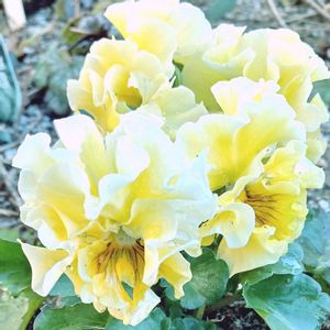 今朝撮りたてのパンジーの レモン色のゆみさん 株は さほど大きくないのに ボリューム満点になりました 🤍🍋꒰*˙꒳˙*꒱🍋🤍
