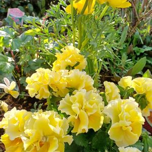 黄色のラナンキュラスさんと 黄色のパンジー ゆみさん 日向だと キラキラ 眩しいです 🍋\(❁´∀`❁)ノ𖤐🍋