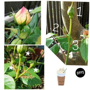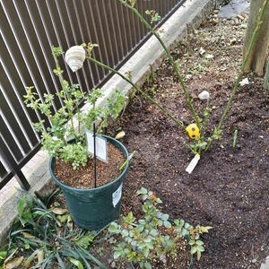 お早うございます🍀先日休みの日に3回目の農薬噴霧をした際に集まってもらった私の薔薇たち 2月の写真と比べると生長したのが分かるでしょう 冬剪定で葉を取らなかったモーツァルトはジャングルの様…w ずんぐりむっくりのジャンティーユは早くから蕾を見せ(房咲きの蕾は一緒に成って包まれてるんですね)期待しますけれど根の生長はどうかと気になります 今年は暑いのか?芽が出るのも早かったし不安でも有りますね ウォラトンは思った程蕾が来ません背は伸びましたけれど2年目で今年から本番と手を掛けていますが😄