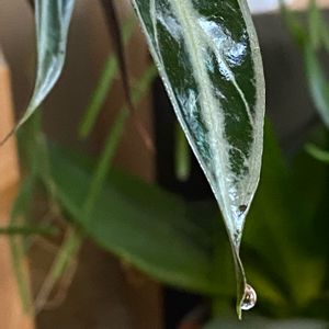 「夜の女神」の涙か? 朝だけ、葉先にキラリと光る水滴を溜めています。まるで夜とのお別れを惜しむかのようです。 置き場所に注意しないと、思わぬ被害に遭うこともありますね。