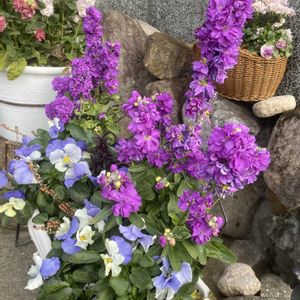 今日は嬉しくなった寄せ植え2つを紹介したいと思います❣️ ①枚目 💜の八重咲きストック 💙🤍パンジーのマリアブルーオーシャン 盛り盛りに咲いて、凄い👏✨ ⭐︎このパンジーは6月頃まで咲き続けると聞き、その凄さを検証中です‼︎ ②枚目 🧺カゴの寄せ植え🧺 🌸パンジー 天の羽衣 2種類 フリル咲き✨✨ めちゃくちゃ可愛い😍 🌼ネメシア マリー オマージュパイン 一度✂️ 再度咲いてきました❣️ 優しいイエローとピンク ほんわか甘い香り🤭 沢山咲いて感動します🥰 見て下さってありがとうございます🙏✨💕