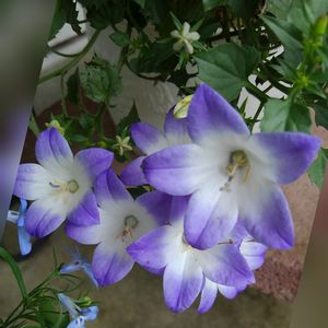 《カンパニュラ ファンシーミー》 釣鐘型の花は直径5㎝前後。 咲く方向は下向きは少なく、ほどんどが横や上を向いています😊 色は青紫、薄紫、白、ピンクなどがあります🌸🌼 葉は地面と平行に、張り付くようにして生えるのが特徴的です😊🌸
