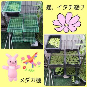 メダカ水槽 足の踏み場がなくって ホームセンターで 棚を買ってきて組み立てて セッティングしました 猫、イタチ避けに 100均で買った フェンス??に ネットを張ってみました