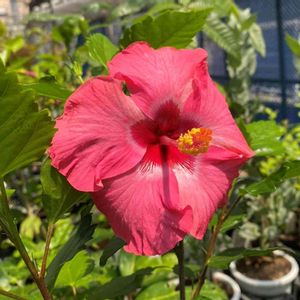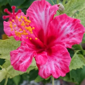 実家のハイビスカス タイミング悪いのか花姿を見たことがなく 下葉は緑なのに枝先はこのようなので、いつも 枯れそうだなぁ…😱と思ってました。 今回、🌺が咲き品種名判明。 “ハミングバード”でした。 ググっても情報が少なく、新葉? それともこれは、栄養不足?🤔 モザイク状の網目模様と粗いギザ葉が 特徴のようです。 🌺は、もっと驚きだった…つづく