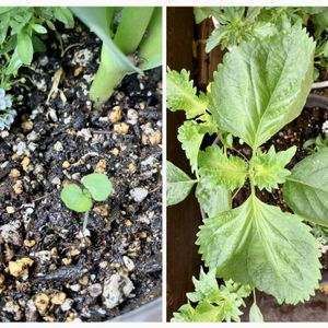 左は3/30 いつの間にかチューリップの脇に出てきた芽🌱 右は今朝のシソの葉。 去年のバジルの種のおこぼれかな、と楽しみにしていたら、シソでした😊 シソも大好き💕大きな葉っぱに育っています!3本出てきています🤗 そう言えば、去年はシソの葉そのものはあまりうまく育たず、種でシソの実佃煮が少し作れたのでした! もう少し広い場所に植え替えてあげなくちゃね。