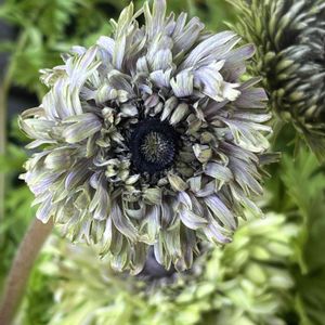 アネモネ『花舞喜』 お迎えして1ヶ月ほど。ずっと咲き続けています。他のアネモネみたいに花びらが落ちないので、終わりがわかりません。 現在最初の子の花色がグレーからグリーンになってきました。終わってるのかな?どうかな? 全然見えませんが😅 下から5個ぐらいグレーのお花が上がってきているので、カットした方が良いのかも?🤔 花舞喜さんの赤が売れ残って半額に‼️欲しい🥺でもこれ以上鉢を増やしてはいけない!我慢して帰りました。