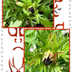 3年目の赤のアネモネ花舞喜さん。 花芽が3つあります。 黒い花芯が見えますね、まわりの花びらがグリーンで、ほんのり赤のなごりがチラホラ… 弱ってきているのか?花数も少ないし、赤で咲かない。でも絶えることなく🌱は出てくる。 思いきってさよならすべきか?悩むところです😥