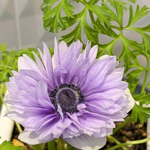 アネモネ 花舞喜(カブキ) 凛々花さんからアンティークな株を選抜した子だそうです。 2年前は赤❤️をお迎えして、次はパープル系と思っていましたが、この子にキュン🫰 シルバーというかグレー🩶というか、灰をかぶったみたいな色? でも株元の大きい子はグリーン?💚🤍 とにかくシックなアネモネさんです😍🩶 ④ 2年株でガッチリしています。蕾もたくさん控えていますよ。(色の比較に→後ろのビオラはマリアさん) ちなみに2年前の赤は、🌱は出ていますが蕾が… 葉っぱ少ないから難しいかな😓