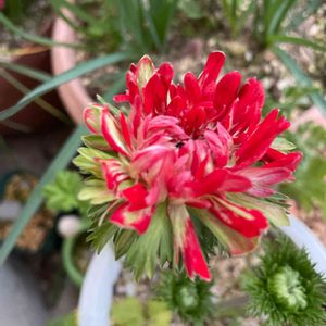 💚❤️ アネモネ(花舞喜)❤️💚 ⬇️下からどんどん太い茎が上がってきて、たくさん咲いています❣️ 株元にもたくさん蕾が待機中。 ⬆️いつ見てもかぶいています😆❤️ 八重咲きタイプのアネモネ(凛々花)から出た個性的な子。出現率が少ないので流通も少なめの希少品種だそうです。 花舞喜(カブキ)といいます。