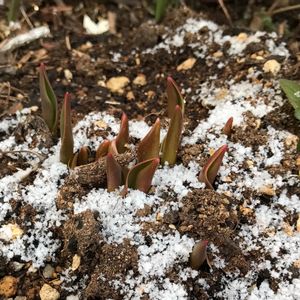3月3日2枚目です。 三寒四温で季節は春へ。 名残り雪に、寒そうというよりあったかそうなチューリップの芽です。 ホソク 昨春から球根は埋めっぱなしなので、密に芽が出ています。でもどれくらい花が咲くかは??? ズボラな花壇にて😆