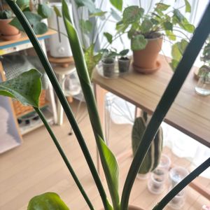 アンスリウム4姉妹👭👶アンスリウム原種クラリネルビウム😊まあるいハート形の葉っぱが大好きです〜😊 アンスリウム・クラリネルビウムは、アンスリウムという大きな属の中の**「原種(種小名: clarinervium)」**の一つです。 アンスリウムの仲間は世界に600種以上もあるとされ、大きく分けると、花(仏炎苞)を楽しむ「一般園芸種」と、葉の美しさを楽しむ「原種系アンスリウム」に分けられます。 クラリネルビウムは後者の**「葉の美しさを楽しむ原種系アンスリウム」**の代表格です。 🍃 葉を楽しむ原種系アンスリウムの主な仲間 クラリネルビウムと同じように、葉のユニークな形や葉脈の美しさが魅力の原種系アンスリウムには、以下のような種類があります。 1. ハート型の葉と白い葉脈を持つ種類 クラリネルビウムと同様に、ベルベットのような質感の濃い緑色の葉に、白やシルバーのくっきりとした葉脈が入る種類です。 • アンスリウム・クリスタリナム (A.\ crystallinum) • 葉の形はクラリネルビウムに似たハート型で、白くはっきりとした葉脈が特徴です。 • 特に葉が丸みを帯びた**「ドラヤキ」**と呼ばれる品種も人気があります。 • 和名では「シロシマウチワ」とも呼ばれます。 2. ユニークな形の葉を持つ種類 ハート型とは異なる、特徴的な形や質感を持つ種類です。 • アンスリウム・フォルゲッティ (A.\ forgetii) • 葉の形が**小ぶりな涙型(または円形に近い)**で、付け根の切れ込みがない、ユニークな形をしています。 • 濃い緑色の葉にシルバーの葉脈が入り、成長するにつれて葉脈のシルバーが濃くなるのが特徴です。 • アンスリウム・ワロクアーナム (A.\ warocqueanum) • 細長い縦長の葉を持つ、非常にエレガントな種類です。 • 葉脈はあまり目立ちませんが、葉の表面全体がベルベットのような質感と光沢を持ちます。 • アンスリウム・ビレナオルム (A.\ veitchii) • 非常に大きく縦長の葉を持ち、成熟すると30cm以上になる大型種です。 • 葉の表面には光沢があり、波打つような凹凸(アコーディオンのような見た目)が特徴的です。 3. その他 • アンスリウム・フーケリー (A.\ hookeri):団扇のような丸い葉をロゼット状に広げるタイプで、バリエガータ(斑入り)種も人気です。 クラリネルビウムは、これらの葉を楽しむ原種の中でも、比較的小型で育てやすく、葉脈のコントラストが非常に美しいことから人気が高く、**「ベルベットアンスリウム」**の代表的な種として愛されています。