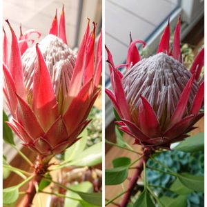 こんにちは😊 いつもいいね💓やコメント💬ありがとうございます🥰 毎日撮影しているプロテアさん、昨日と今日の分、まとめてアップしました📷️ 昨日はお日様が当たってキラキラ~✨してましたが、今日は曇りでどよ~んとした写真になってます 😅