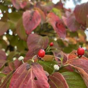 春の白い花も魅力ですが この時期の赤い葉 真っ赤な実 惹かれて 毎日眺めてます❣️ 今年はとくに 綺麗な ハナミズキ ꕤ.。 ③アジサイと ベンチ 🪑🪑🪑 🍁🍂 秋色なのか ただアジサイの色が薄くなったのか 🤭