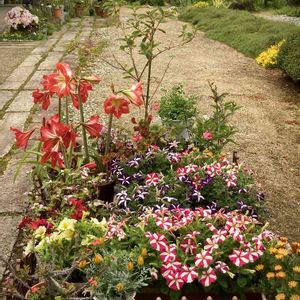 即席花壇 鉢植え、ミニプランター植え、を集めてミニ花壇を作って見ました。 🌱🌸🌼🍀🤗 目立ってるのはペチュニア、アマリリスですね。🙌