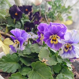 今朝のミニビニールハウスの中から出す前です(人 •͈ᴗ•͈) ゆっくりですが半日陰でも休まずに咲いてくれています*.✧よかった♪ ①ヌーベルヴァーグ ラピスラズリとパピヨンノワール ②アネモネ フルゲンス ③ビオラ レディ
