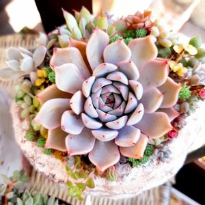 秋に作ったブロークン・ポット・ガーデン のびのび~徒長しまくり~💦 モルタル鉢のピンクザラゴーサが 青白くなってきた💖 これはこれで綺麗かも✨