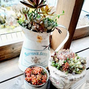 可愛い水差し風ポットの寄せ植え✨ 高さのあるポットに寄せるのは初めて💕 バランスが難し~い💦 グリーンネックレス垂らしたかったけど 無かったのでルビーネックレスをチョロリ💦