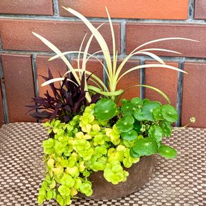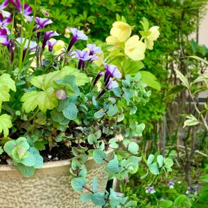 玄関 花*花 <春の寄せ植え> 明るい白葉とシックな黒!^^ 丸い葉っぱも可愛いてす!(๑>◡<๑)🌿♪ 葉っぱでまとめてみました!!🪴 白 : アケボノ 黒 : 黒ニガナ 緑 : ウォーターコイン(ウォーターマッシュルーム) 黄 : リシマキア(オーレン)