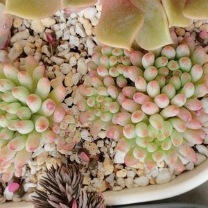 多肉屋つむぎさんのカレン。これからキュッと締まっていくかな。コロンと可愛くなりますように☺️ 2枚目 セダム花火 3枚目 好きに伸び放題の寄せ植え💦 4枚目 名無しのエケさん。かわいい🩷