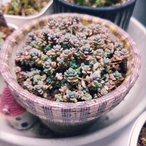 多肉屋つむぎさんのカレン。これからキュッと締まっていくかな。コロンと可愛くなりますように☺️ 2枚目 セダム花火 3枚目 好きに伸び放題の寄せ植え💦 4枚目 名無しのエケさん。かわいい🩷