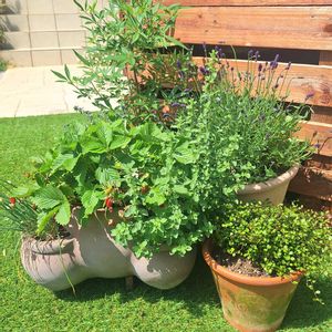 家庭菜園の植え替え完了!昨日仲間入りしたローズマリーウィルマスゴールドすごく可愛い❤️ブルーベリーはちょっと土が足りないかもなので様子見…🫐