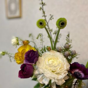 ラナンキュラスが美しい季節です。 ラナンキュラス「煌」。 ひときわ大きく真っ白なラナンキュラス。 次々と花弁が開いてきてどんどん大きくなるのです。奮発して損はないお花です。 ラナンキュラスラックス「サティロスブラウンゴールド」と「グレーシス」 ラックスのゴールド!ツヤっツヤのキラッキラ✴︎ グレーシスは白いラックスでとってもエレガントです。 ラナンキュラス「藍の調べ」 小振りですが深い紫色のシックで素敵なラナンキュラスです。 番外編 ガーベラ「グリグリ」 グリーンのガーベラで極めて可愛い!! 他、アネモネ、アオモジ、リューカデンドロンジェイドパール、タラスピ、クリスマスローズ。 この集団…毎日見ていて飽きません(*´艸`)