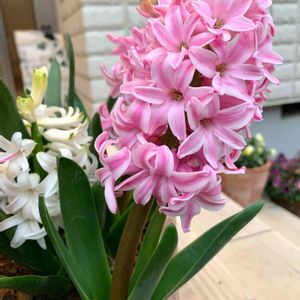こんばんは🌙 ヒヤシンスが咲きました🌸💕 ちょっと傾いていますが😅玄関前で華やかに咲いています🌸💗 今日も一日お疲れ様でした☘🍵