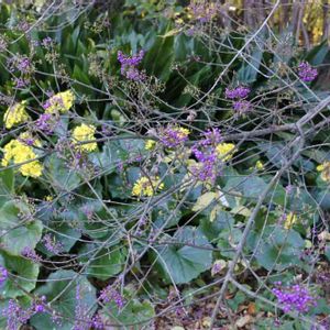 皇居東御苑 花もいっぱい咲いていました。 ツワブキは、今が真っ盛り。 群生しておりましたが、ちょと離れた場所で、終わりかけたムラサキシキブのバックに