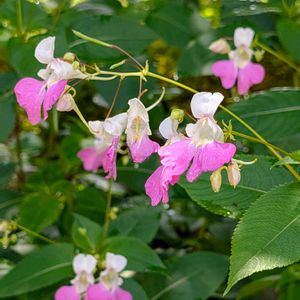 ♡ツリフネソウ♡白・白ピンク(2色)・黄色 ツリフネソウ科 ツリフネソウ属 ツリフネソウ3種類どれもそれぞれ綺麗。 画像の英字は英名Touch-me-not。 種の入ったサヤは刺激を受けると弾ける事からの英名でしょうか! ⚫︎ げんふ桃と白の2色咲きとなる花で、一般には源平ツリフネソウの名前で栽培されています。 ヒマラヤ原産で、日本のツリフネソウよりも花着きが良く、耐暑性もあるので栽培は容易です。 大輪でふくよかな花が群れ咲くようすは、小さな人形が楽しそうに躍っているようにも見えます。 条件が良ければ、こぼれ種子で毎年咲きますが、やはり採種して春にまくのが確実です。