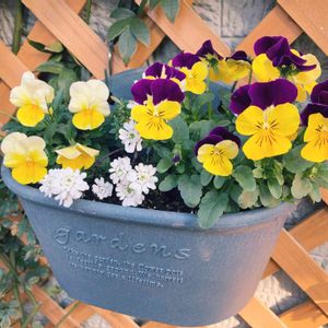少し前に作った 冬の寄せ植え•*¨*•.¸¸♬︎ 葉牡丹 ガーデン シクラメン パンジー ビーコンブルー💜 ビオラ ピーチジャンプアップ 宿根イベリス ネメシア ピンクレモネード 千日小坊 モリモリ元気に育ってね〜(๑˃̵ᴗ˂̵)💓