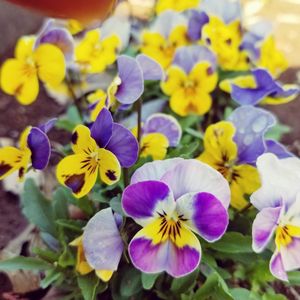 いつもお世話になってるティガーさん✨ 今日はニコニコの日 同じ株かなぁビオラ、手前の色が違っていました、指先もご愛嬌です すみません今日は26日でした