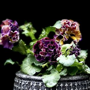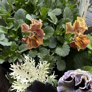 ❶❷パンジー ドラキュラ&ビオラ トミーの庭&ビオラ パスフリ✨✨昨日の寄せ鉢にハボタンを加えてみました🪴