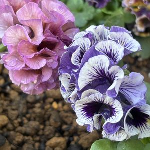 パンジー ローブ ドゥ アントワネット2株と パンジー ドラキュラ3株 ベランダで揃った 毎朝早起きして眺めるのが楽しみになりました