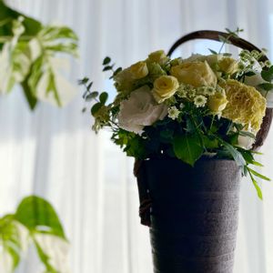 こんにちは♪ バラ「ひよこ」がメインの花束🐥 名前の通り ひよこのように黄色くて丸くて💛 可愛いバラです😊 初めて見るバラですが 本当にいろいろなバラがあるものですね🤭🐥 今日も良いお天気です☀️