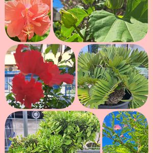 おはようございます☀ ハイビスカス八重 タイタンビカス ザミア(メキシコソテツ) ユーホルビア.ネリーフォリア オオベニゴウカン(大紅合歓) 実家の庭 29℃