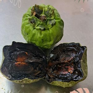 おはようございます🎶 1月8日に投稿したブラックサポテが シワシワになり柔らかくなったので 切ってみた。種が8個入っている。 スプーンで🥄掬い味見❕ クリーミー 薄甘 特にクセは無し😂 ウーン 何とも言えぬ 表現が難しい味でした😀 21℃