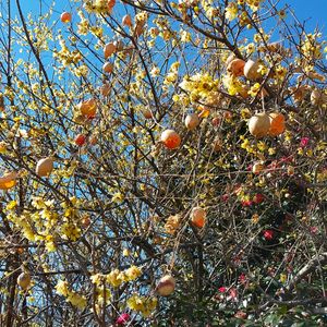 蝋梅にみかん!?いえいえ、からみついて乾燥したままのカラスウリです。 1月蝋梅、3月梅、4月桜と春に近づいていきますね😊