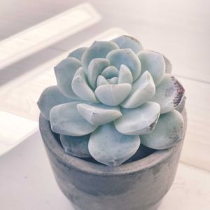 うちのアイスグリーン2号🍨 上から&横から ⚪︎ お水ゆっくり吸う多肉植物にとってセメントポットは乾きやすすぎるかも?と気持ち程度にラップを巻く。あとは防寒になればと。効果は不明🤔