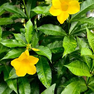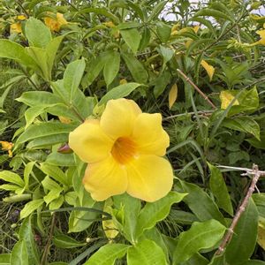 アラマンダ (和名アリアケカズラ) 丈1.5m位 10年近く元気で丈夫です😊 キョウチクトウ科 ↑全草に毒があります💦 春に咲くイペーも南国風の似たようなラッパ型の花ですね🎺 イペーはノウゼンカズラ科で5m位になるそうです。 母宅(鹿児島)
