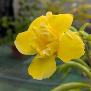 沖縄の日差しに映えるブライトイエローのお花 アラマンダ 有明葛 キョウチクトウ科 アリアケカズラ属 半つる性常緑低木 沖縄でもっとも目立つ黄花のひとつ 英名 golden trumpet vine オオバナアリアケカズラ コバノアリアケカズラ 八重咲きも有るみたいです💛