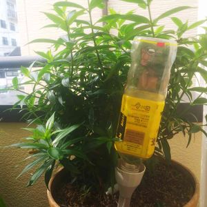 アラマンダがだんだん栄えて枝が伸びてきました~!! 留守中の点滴水やり、肥料やりの実験してます。