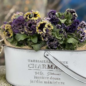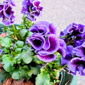 曇り空ですが、昨日よりは暖かです😌 強フリンジパンジー 💚パルムディール💜✨です フリフリのボリュームが素敵なのに、お値段は他のフリルパンジーと同じ位でお得でした😊 寒いので、成長に動きがありませんが春が楽しみ💕