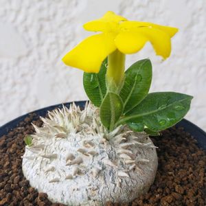 パキポディウム・ブレビカウレ✨ 和名:恵比寿笑い😁 今朝咲いてました♪ お天気悪くて薄暗い中、レモンイエローの花が際立って目を惹きます💕
