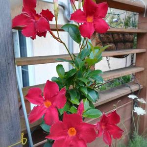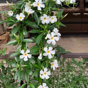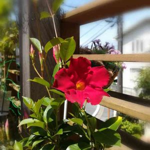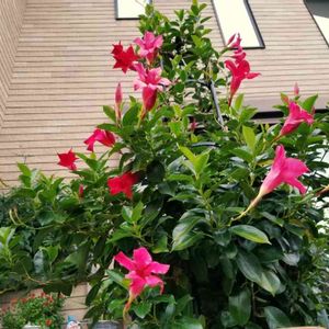 サンパラソル(キョウチクトウ科マンデビラ属) 毎年ついついお迎えしちゃう花です😊 この子は昨年の春に植えて、玄関先で冬越ししました🎵 サントリーのHPでは冬越しは難しいと記載があるけど、特に手を掛けた訳でもないんです😅 強風は吹くけど雪が降らない浜松は、サンパラソルには住み心地がいいのかしら💕 今年は白、アプリコットも植えたから、みんな冬越ししてくれるといいなぁ😊