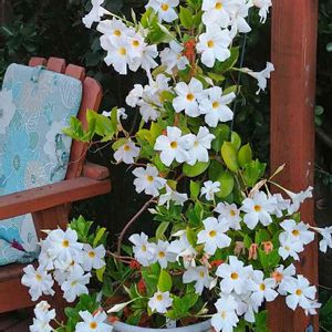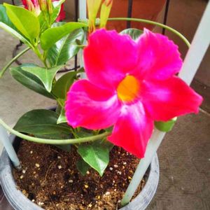 “早く咲く”のポップにひかれ購入したサンパラソル(キョウチクトウ科マンデビラ属) 水も控えめ、摘心いらず、虫もつきにくい、上手くいくかな😃