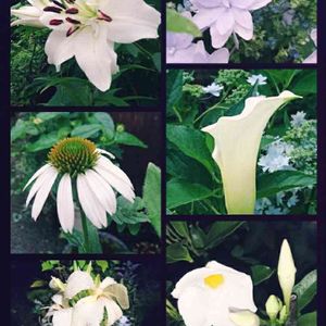 庭に咲く白い花たち❇️ カンナ、エキセアナ、 カサブランカ、隅だの花火 カラー、サンパラソル。 カンナ、エキセアナ、 カサブランカ、隅だの花火 カラー、サンパラソル。